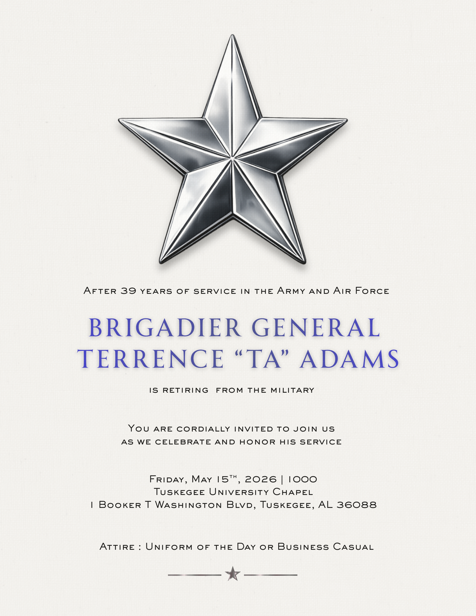 Tuskegee is home to General Adams. Both he and the town have a remarkable legacy of leadership, education, and service. Please take the time to explore the historic campus of Tuskegee University, the Tuskegee Airmen National Historic Site, and other landmarks that reflect the community’s profound contributions to American History.